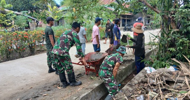 Polewali Mandar - Anggota Koramil 1402-02/Wonomulyo bersama masyarakat melaksanakan kerja bakti pembersihan lingkungan dan saluran drainase di Desa Tumpiling, Kecamatan Wonomulyo, Kabupaten Polewali Mandar, Senin (05/01/2025).