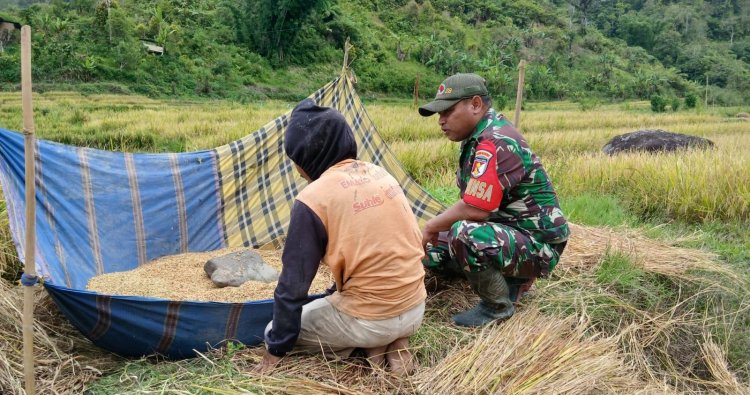 Mamasa, - Babinsa Koramil 1428-02/Sumarorong Sertu Paulus membantu masyarakat merontokkan biji padi di sawah salah satu warga binaan bertempat di Desa Malimbong Kecamatan Messawa Kabupaten Mamasa, Selasa (10/02/2026)