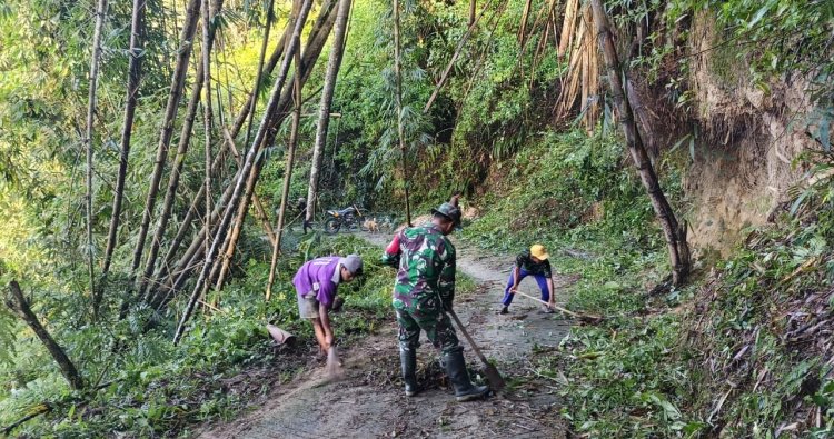 Mamasa, - Babinsa Koramil 1428-04/Pana bersama masyarakat melaksanakan pembersihan jalan yang mulai di tumbuhi rumput jalan di Desa Salutambun Kecamatan Pana Kabupaten Mamasa, Selasa (20/01/2026)