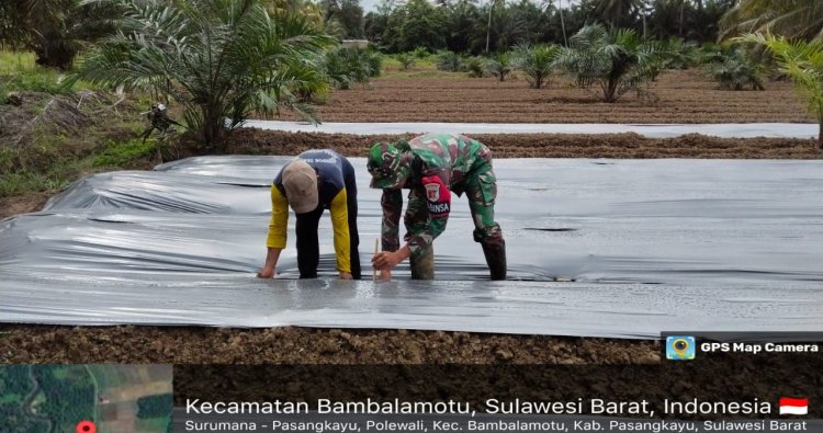 Pasangkayu – Babinsa Koramil 1427-02/Bambalamotu, Sertu Amiruddin, melaksanakan pendampingan pertanian dengan membantu pemasangan plastik mulsa di lahan milik warga Desa Pangiang, Kecamatan Bambalamotu, Kabupaten Pasangkayu, Kamis (1/1/2026).