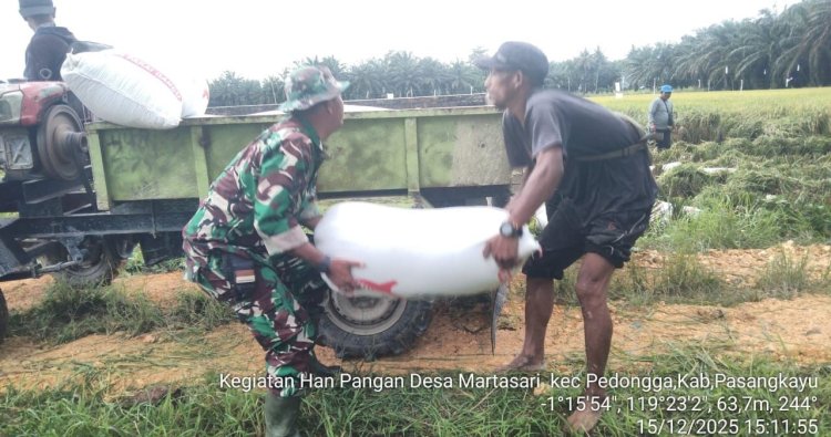 Babinsa Koramil 1427-01/Pasangkayu, Sertu Ahmad Sultoni, melaksanakan pendampingan panen padi di Kelompok Tani Batu Kapal, Dusun Nakula, Senin, (15/12/2025).