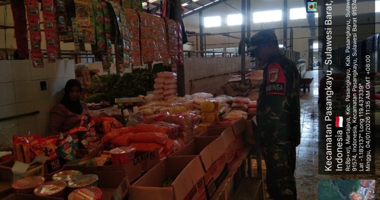 Pasangkayu — Komitmen TNI AD melalui peran Babinsa dalam menjaga stabilitas keamanan dan kesejahteraan masyarakat kembali ditunjukkan di Pasar Tradisional Martajaya, Kelurahan Martajaya, Kecamatan Pasangkayu, Kabupaten Pasangkayu. Minggu siang, 4 Januari 2026, Babinsa Koramil 1427-01/Pasangkayu Sertu Hamzah terjun langsung melakukan pemantauan keamanan pasar sekaligus memastikan harga dan ketersediaan bahan pokok tetap stabil, di tengah aktivitas jual beli masyarakat.