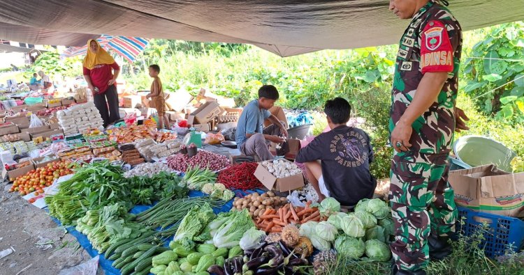 Interaksi yang hangat antara Babinsa dan masyarakat menambah suasana pasar semakin hidup dan penuh keakraban.