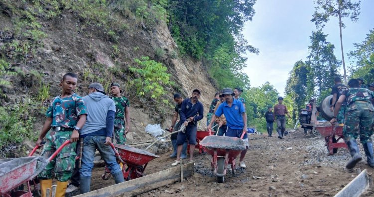 Sejak pagi, anggota TNI dan masyarakat terlihat bahu-membahu mengangkut material, mengaduk campuran semen, hingga meratakan rabat beton di jalur yang selama ini menjadi impian warga. Canda dan tawa sesekali terdengar di sela-sela kerja keras, mencerminkan kebersamaan yang kian erat.