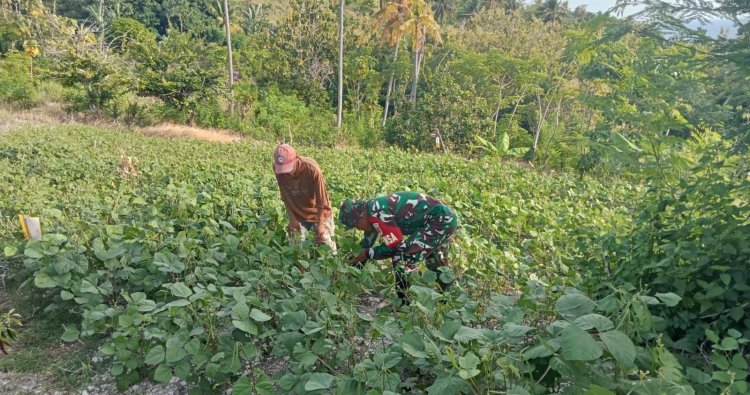 Majene - Dalam rangka mewujudkan ketahanan pangan di wilayah binaan, Serda Suardi Bali Babinsa Koramil 1401-02/Pamboang Kodim 1401/Majene hadir sebagai pelopor bersama petani kacang hijau di lahan milik BUMDes Bonde yang dikelola Poktan Tunas Harapan seluas 20 are yang terletak di Desa Bonde, Kecamatan Pamboang, Kabupaten Majene, Selasa (10/2/2026).