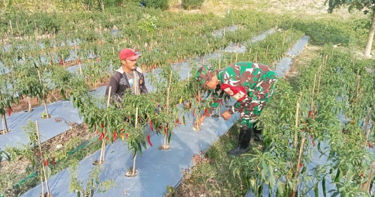 Tampak kebersamaan Babinsa dengan petani di lahan cabai, mulai dari pengecekan kondisi tanaman, perawatan batang, hingga memastikan pertumbuhan tanaman berjalan optimal.