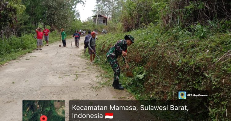 Mamasa, - Babinsa Koramil 1428-01/ Mamasa Serka Daenmengge melaksanakan karya bakti bersama dengan warga binaan dalam rangkah membersihkan jalan di Desa pebassian Kecamatan Mamasa Kabupaten Mamasa, Senin (15/12/2025)
