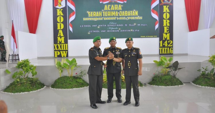 Mamuju — Jabatan Komandan Kodim (Dandim) 1402/Polman resmi berganti. Letkol Inf Ikhwan Arifin, S.Pd kini memegang tongkat komando Kodim 1402/Polman usai mengikuti upacara Serah Terima Jabatan yang dipimpin Danrem 142/Tatag Brigjen TNI Hartono, S.I.P., M.M., di Aula Andi Depu Makorem 142/Tatag, Selasa (16/12/2025).