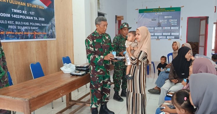 Polewali Mandar – Satuan Tugas (Satgas) TNI Manunggal Membangun Desa (TMMD) ke-127 Kodim 1402/Polman menyalurkan makanan tambahan bagi balita di Desa Bulo, Kecamatan Bulo, Kabupaten Polewali Mandar, Minggu (15/2/2026), sebagai upaya mendukung percepatan penurunan angka stunting di daerah tersebut.