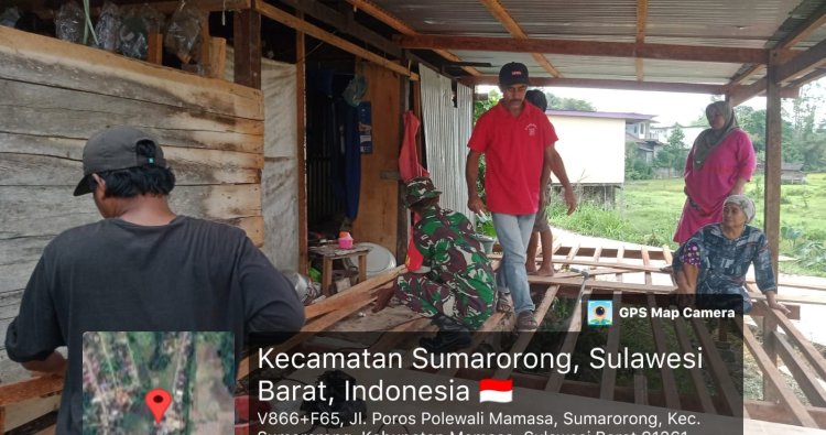 Mamasa, - Sebagai wujud kemanunggalan TNI dan Rakyat, Babinsa Koramil 02/Sumarorong Sertu Baharuddin membantu Warga dalam memperbaiki rumah milik salah satu warga di wilayah binaan Kelurahan Sumarorong Kecamatan Sumarorong Kabupaten Mamasa, Selasa (18/11/2025)