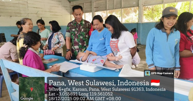 Mamasa, - Babinsa Koramil 1428-04/Pana Sertu Suliadin melaksanakan kegiatan pendampingan Pelayanan Posyandu di Posyandu Balita yang bertempat di lingkungan liasa kelurahan Pana Kecamatan Pana Kabupaten Mamasa, Kamis (18/12/2205)