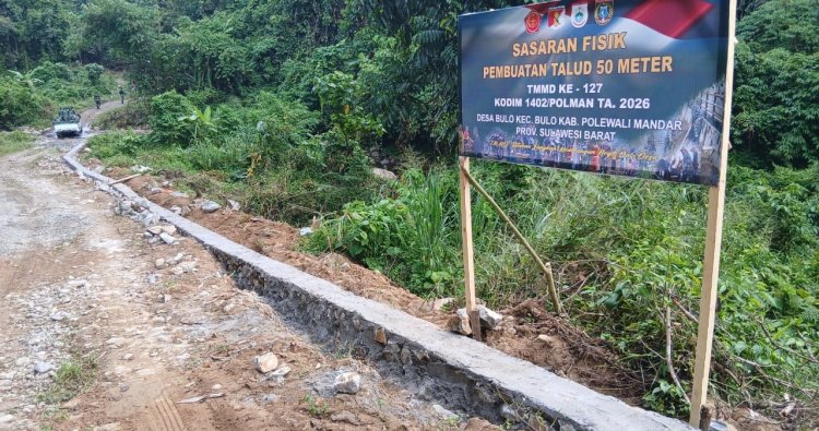Polewali Mandar – Pengerjaan talud sepanjang 50 meter yang menjadi salah satu sasaran fisik TNI Manunggal Membangun Desa (TMMD) ke-127 Kodim 1402/Polman di Desa Bulo, Kecamatan Bulo, Kabupaten Polewali Mandar, Sulawesi Barat, rampung 100 persen, Jumat (13/2/2026).