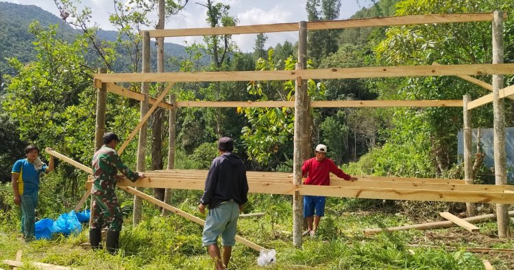 Mamasa, - Babinsa Koramil 1428-04/Pana melaksanakan kegiatan pembuatan kandang ayam bersama dengan masyarakat di Desa Tadokaloa Kecamatan Tabang Kabupaten Mamasa, Sabtu (31/01/2024/6)