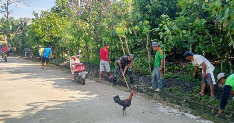 Polman-Anggota Koramil 1402-02/Wonomulyo bersama masyarakat kembali menggelar aksi kerja bakti pembersihan lingkungan dan saluran drainase di Desa Sattoko, Kecamatan Mapilli, Kabupaten Polewali Mandar, Kamis (27/11/2025).
